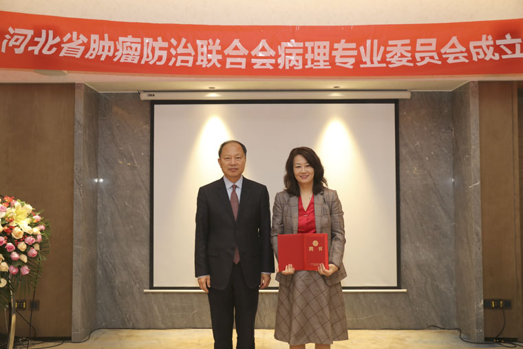 10月17日,由河北省肿瘤防治联合会主办,我院病理科承办的河北省肿瘤防治联合会病理专业委员会成立大会暨河北省肿瘤防治联合会病理专业委员会第一次学术会议以线上线下相结合的形式召开,我院刘月平教授当选第一任主任委员,河北省肿瘤防治会主席单保恩教授为刘月平教授颁发证书。