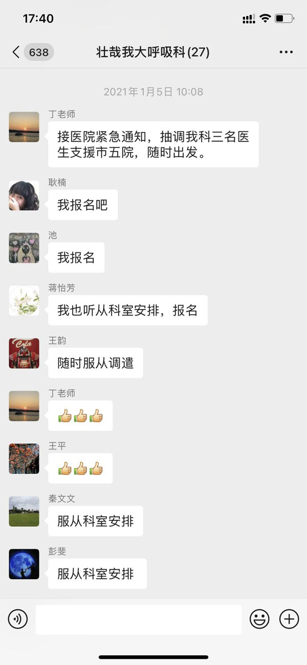 1月5日上午,呼吸内科接到我院抽调医护人员参与组建抗疫医疗队的任务,短短的几分钟内,科室微信群里请战的信息滚动刷屏。没有华丽的辞藻,没有空洞的口号,一句简单的“我报名”,体现了呼吸内科医护人员面对疫情无所畏惧、勇敢向前的亮剑精神。